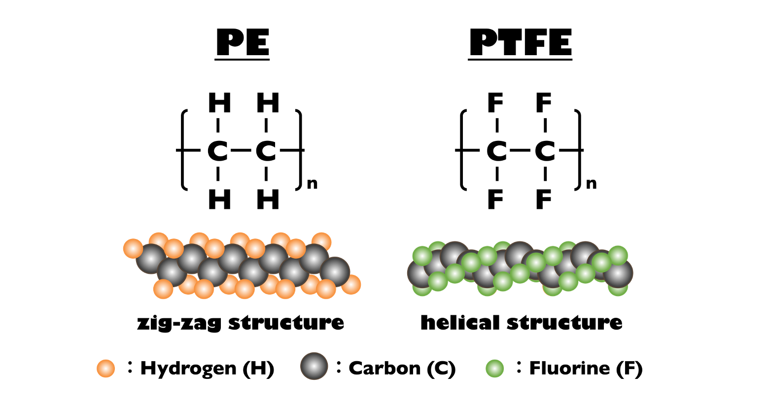 The exceptional properties of PTFE stem from its extreme resistance to reacting with other substances, which is attributed to its strong atomic bonds and unique resin structure. This can be easily understood when compared to hydrocarbon-based resins composed of hydrogen and carbon. Below is a comparison of the structures of PE (Polyethylene) and PTFE.